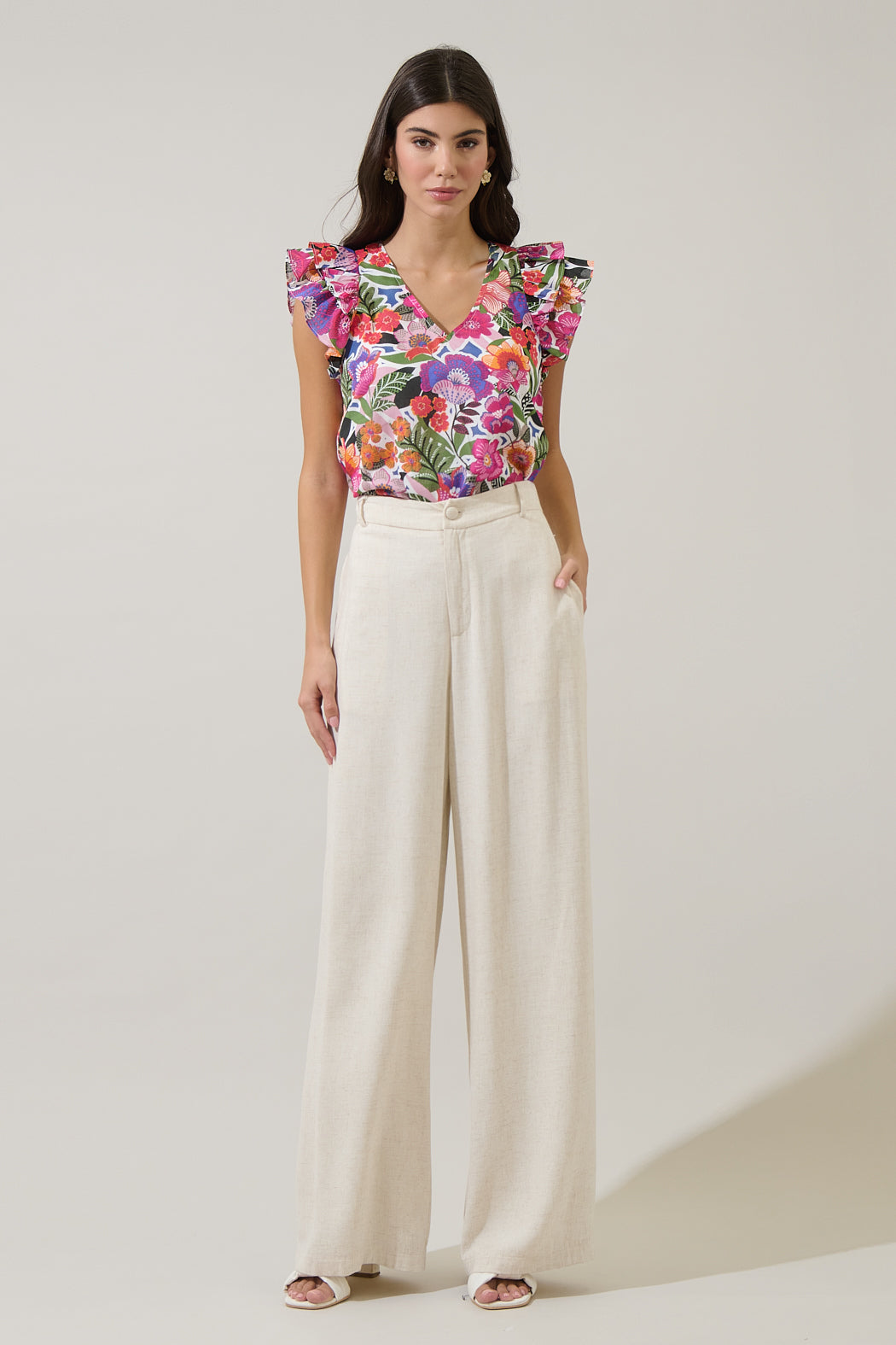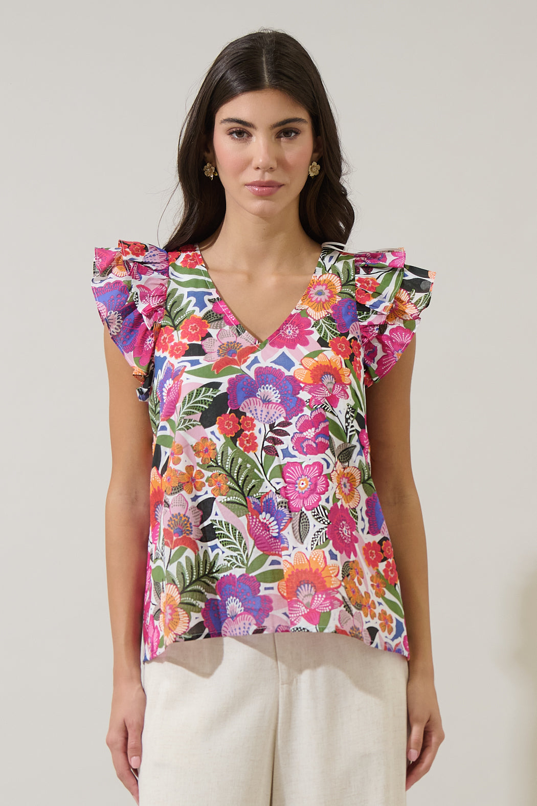 Inject instant joy and color into your wardrobe with this top. Layered ruffles on the short sleeves give it a dramatic touch. It has a v-neckline with a classic fit. Wear it with white pants and a cute pink head piece.