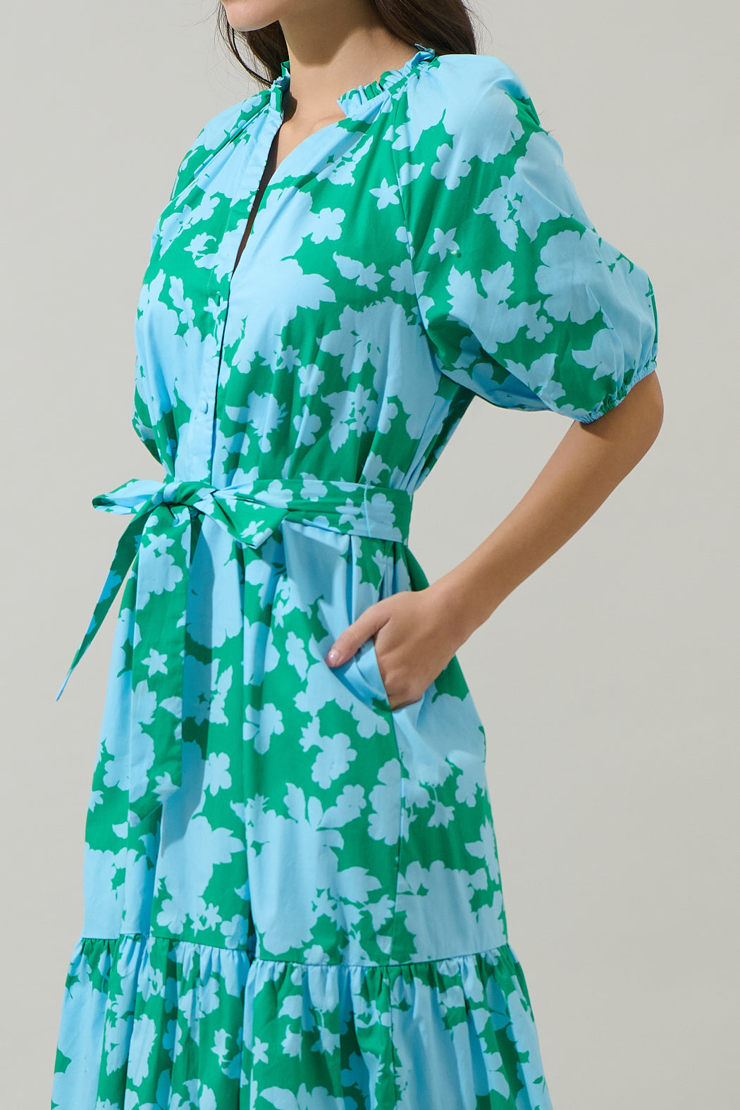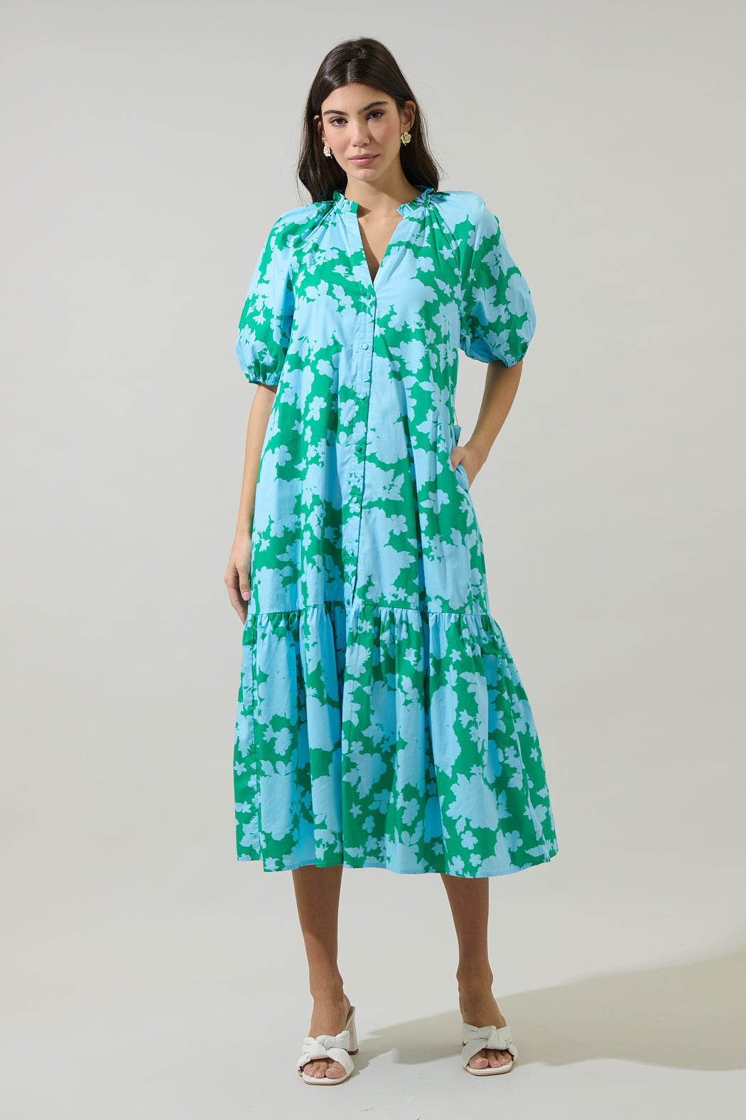 Make your day extra whimsical by slipping into this dress.A lightweight cotton shapes a tiered midi dress. Voluminous puff sleeves highlight a split neckline that leads to a functional button front. A tie sash wraps around the waist, adding shape to a single. tiered midi skirt. Easy to match with white strappy heels!