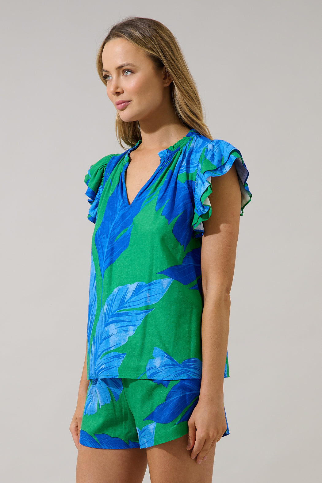 Bright, breezy, and totally tropical. The cute top shapes ruffle layer cap sleeves that frame a split neckline and billowing bodice. Wear it tucked into the matching shorts and some heels to go along.