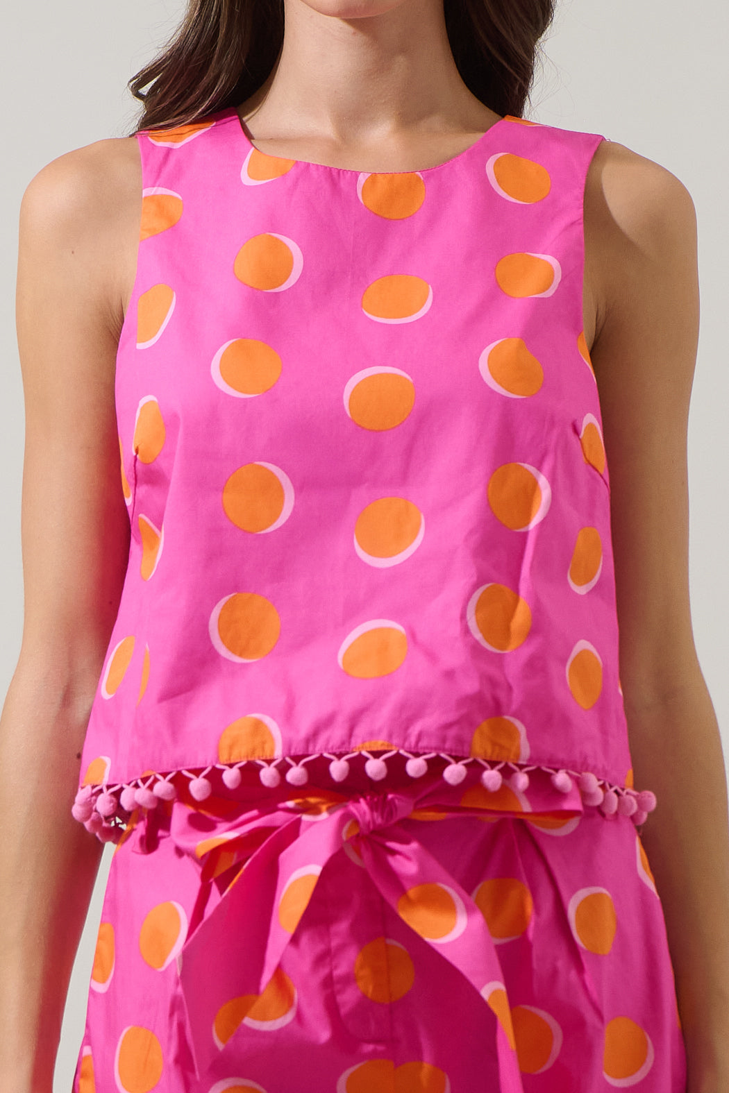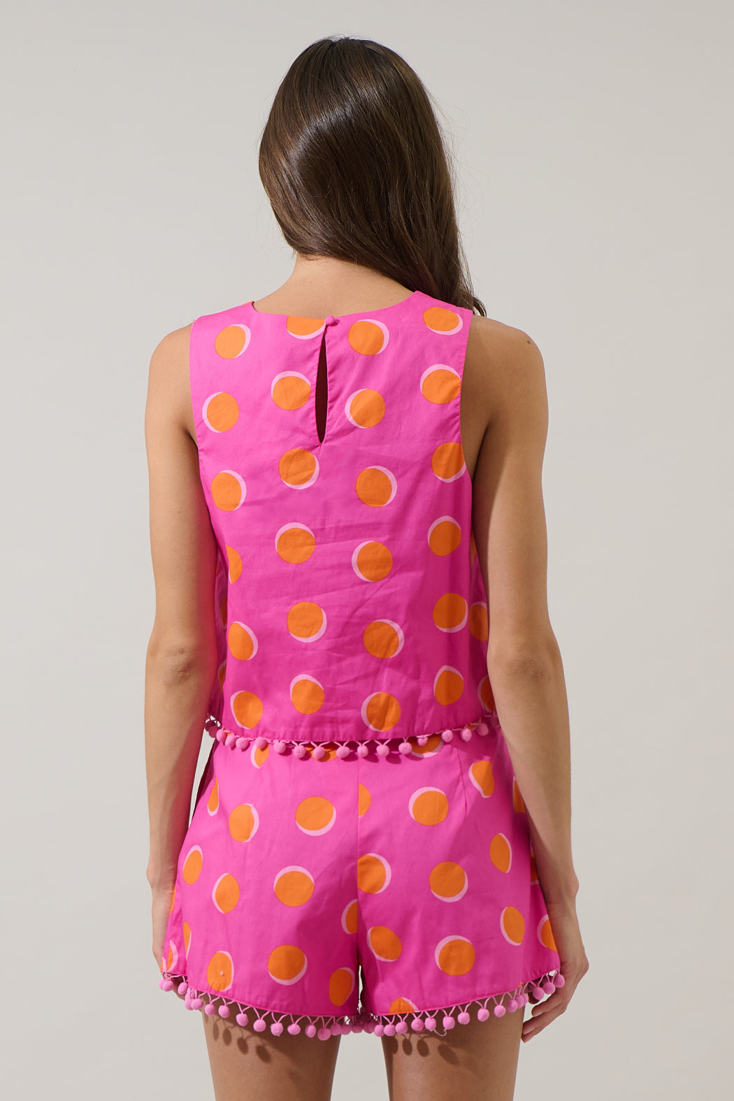 Dots and charm! Add a playful touch to your wardrobe with this sleeveless polka dot top, featuring a flirty pompom trim at the hem for extra charm. The keyhole detail at the neckline adds a hint of sophistication. Perfect for pairing with the matching shorts for a fun, effortless look.
