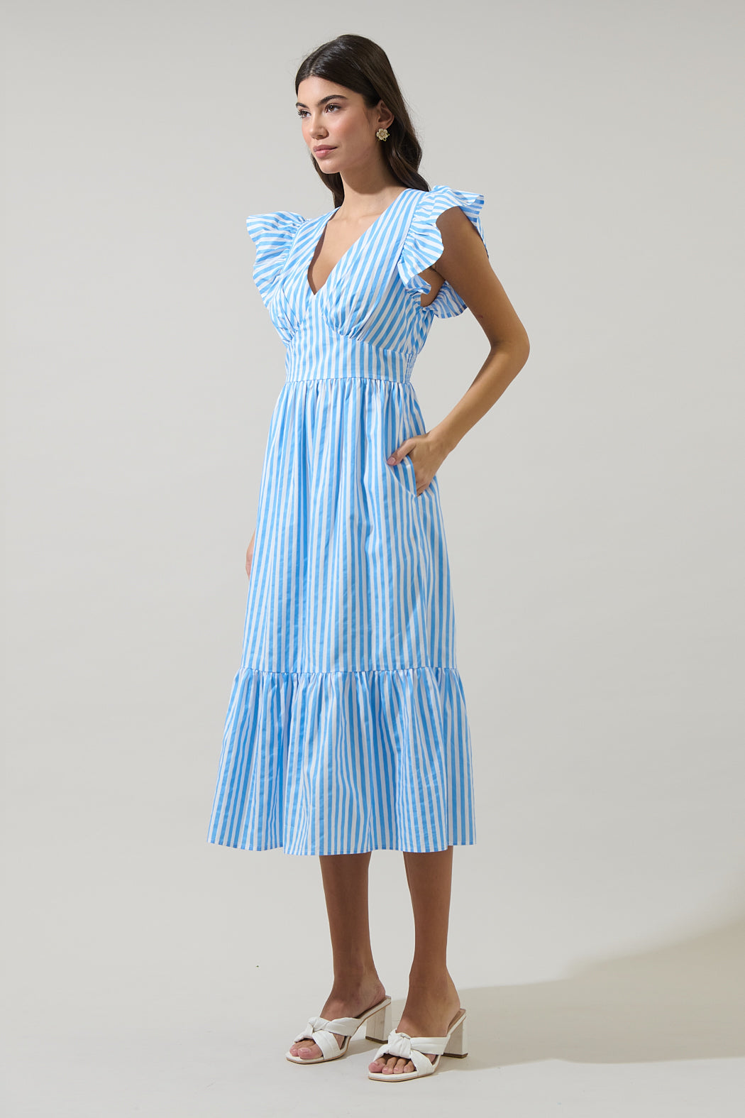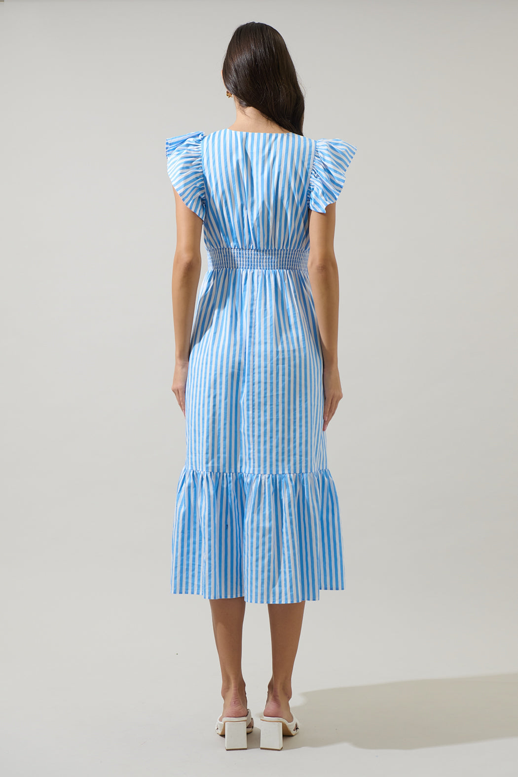 Stripe into summer with a dress that’s full of fun. Its ruffle cap sleeves and cute v-neckline give it a nice touch. The back has an elastic waist. Pair it with your favorite heels or sandals.