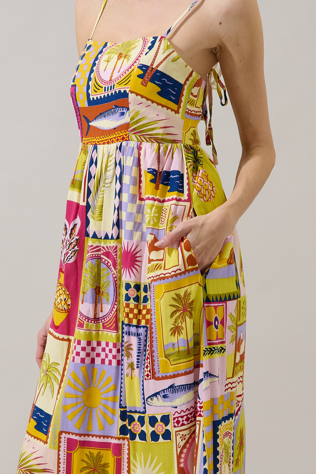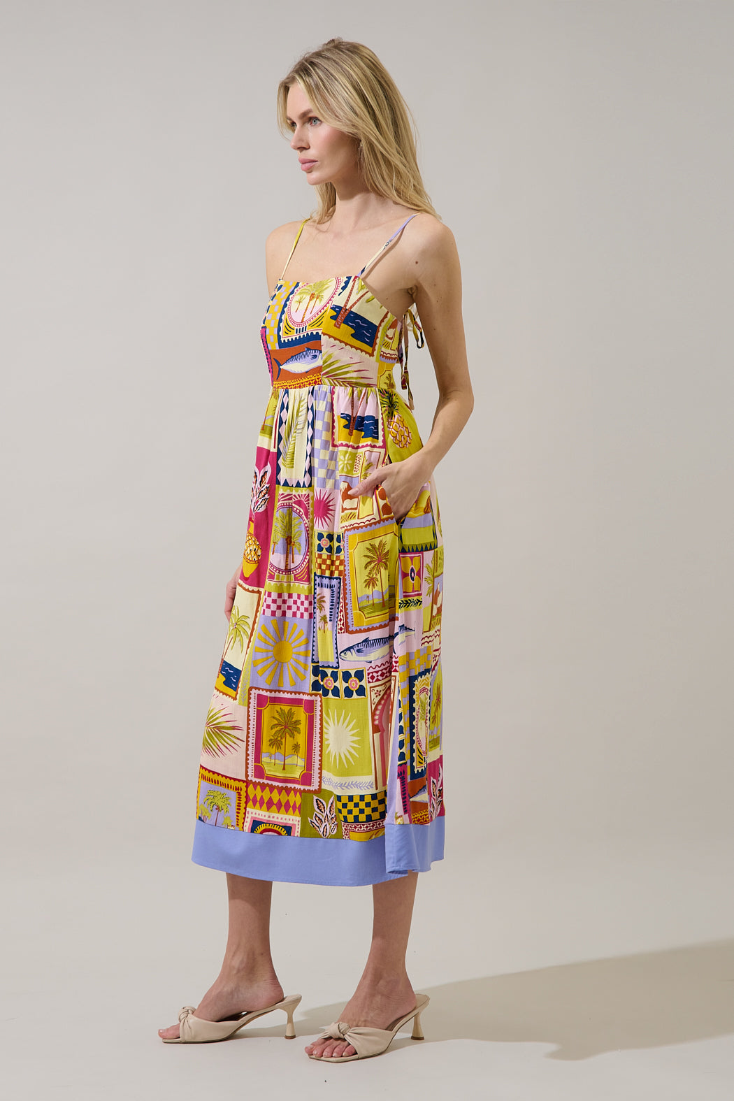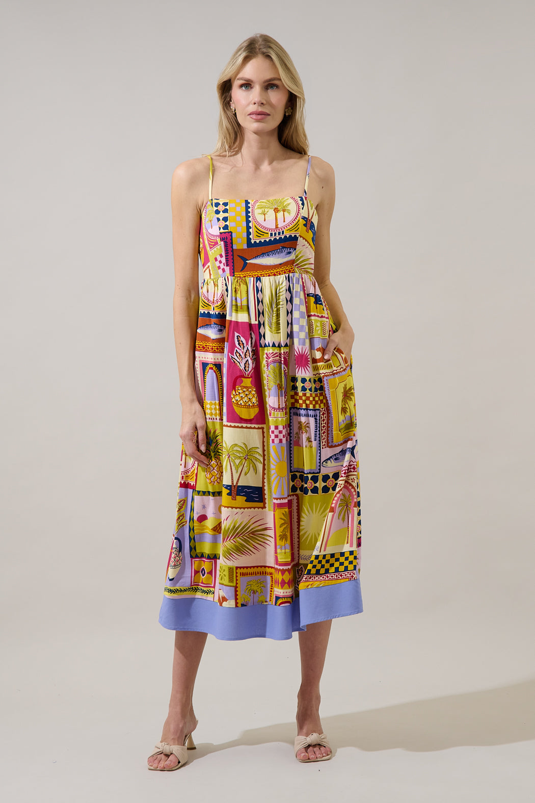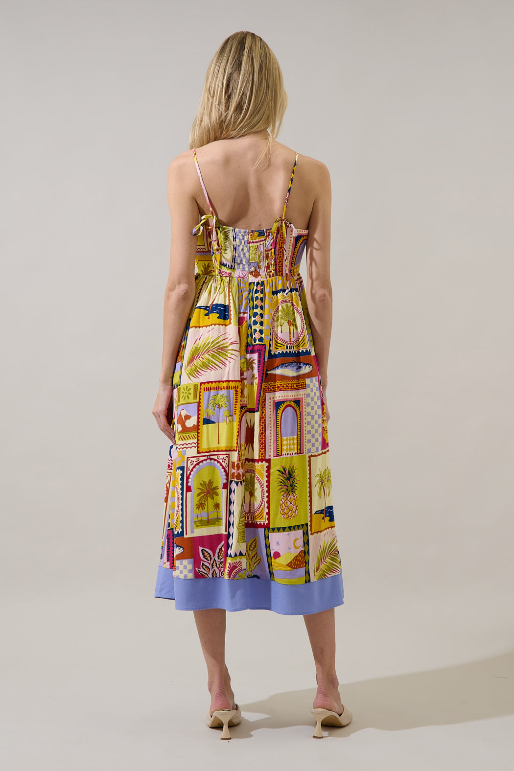 Postcard perfect style, no passport required! A fun print designs this midi dress with spaghetti straps around the shoulders, leading to a smocked back and invisible zipper. The bottom skirt maintains a flowy fit. Easy to pair with heels or sandals.