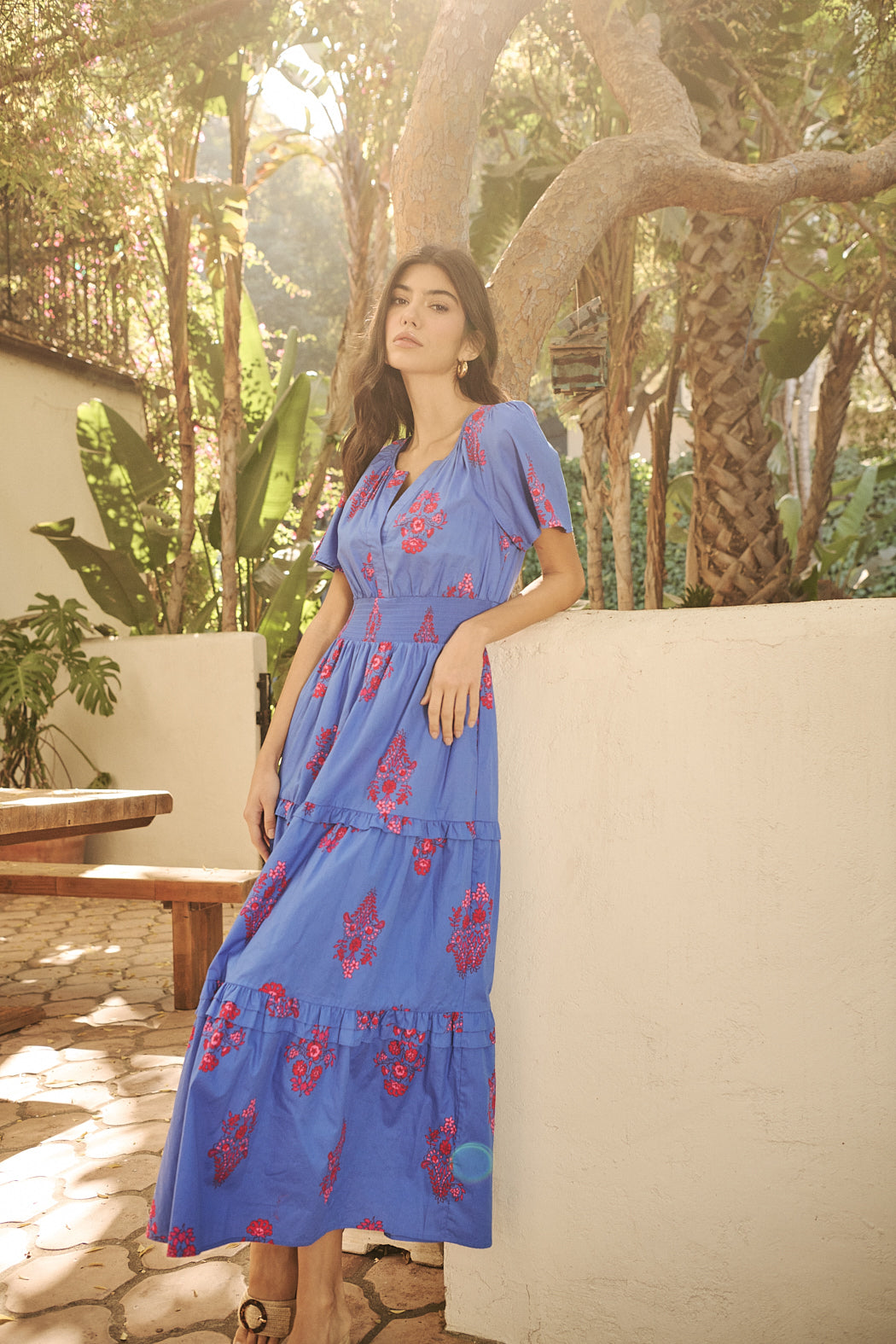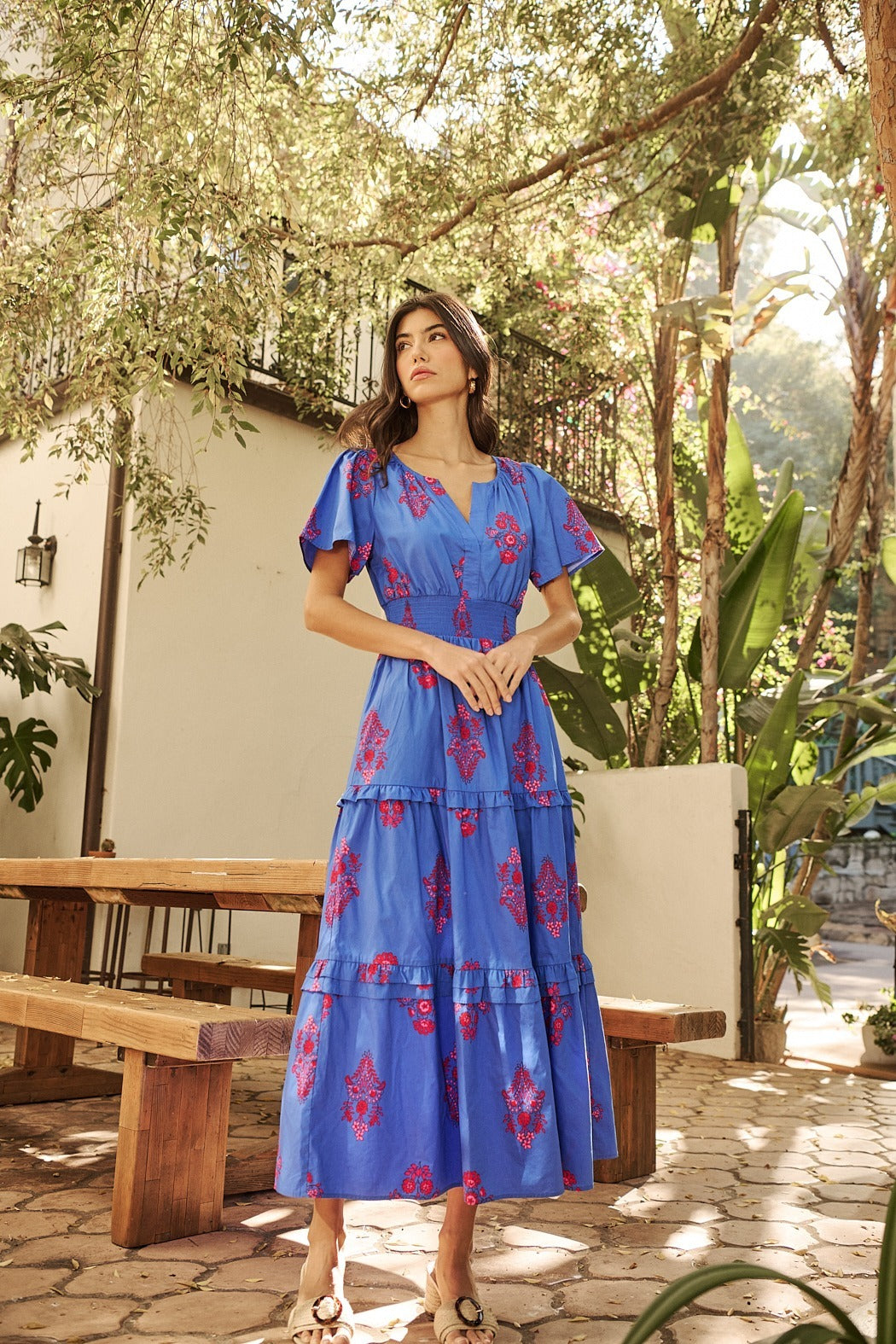 Our best seller Palmer Poplin Tiered Maxi Dress meets the new Shayna Floral to create a beautiful dress this season. Lightweight poplin maxi that features a split neckline and billowing short sleeves. The smocked waist tops ruffle tiered layers to a lengthy skirt. It’s a cute dress to pair up with any shoes!