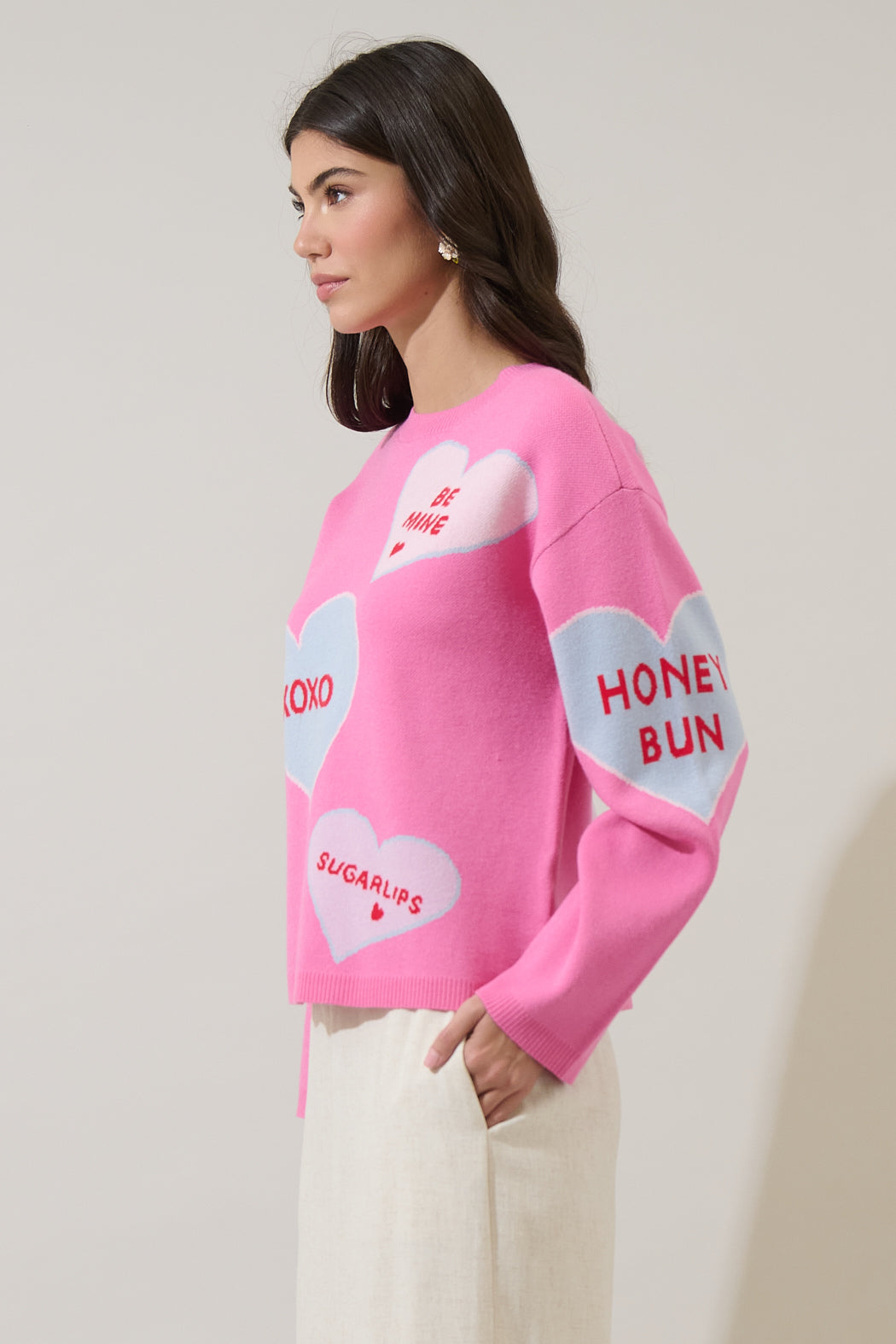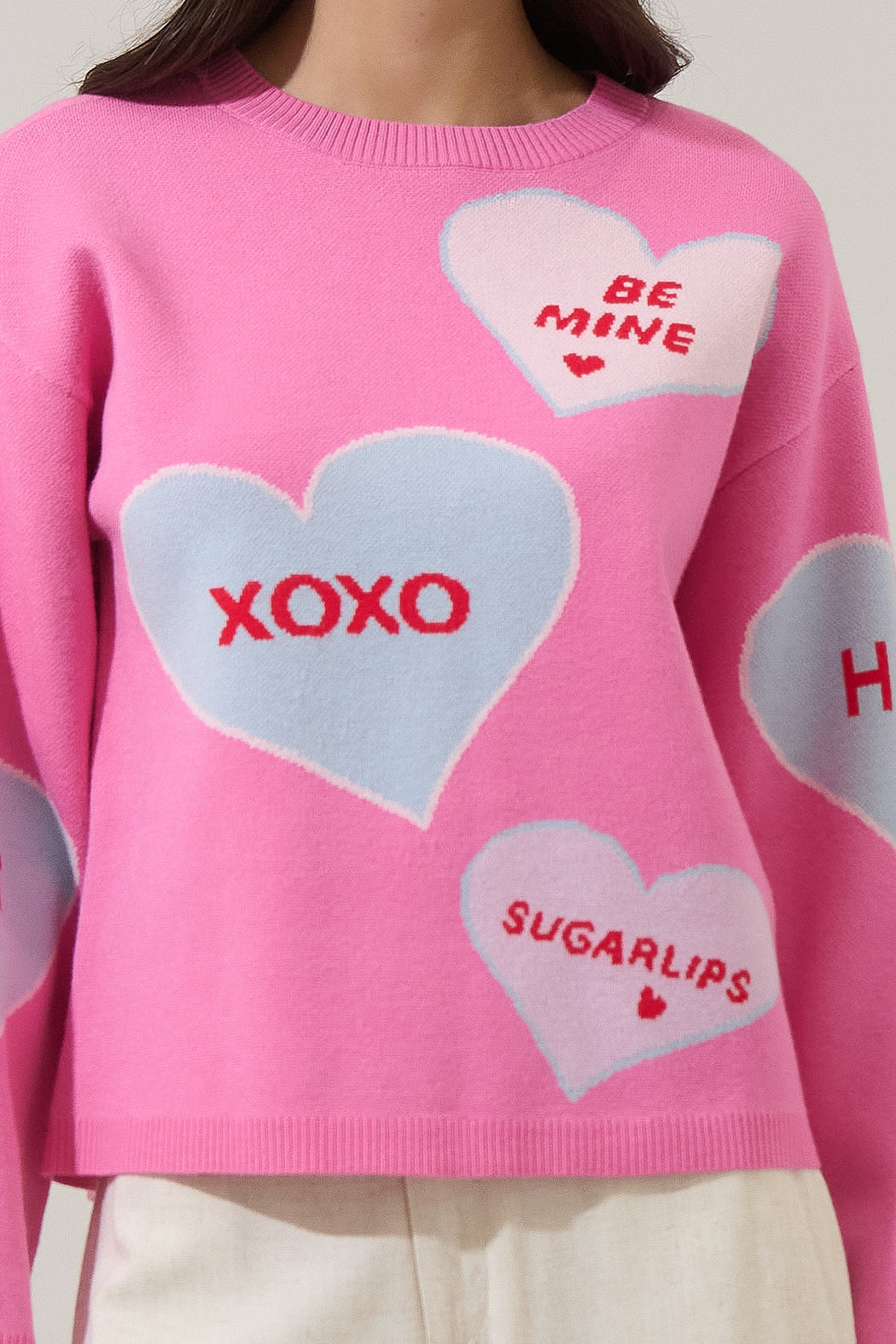 Spread the love and sweetness with this adorable sweater. Crafted from a super soft, cozy knit, this crewneck offers a relaxed fit, with long sleeves. The edges have a ribbed design. Wear it with denim jeans or white pants.