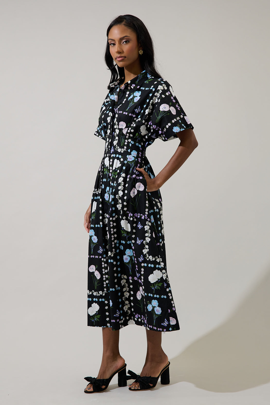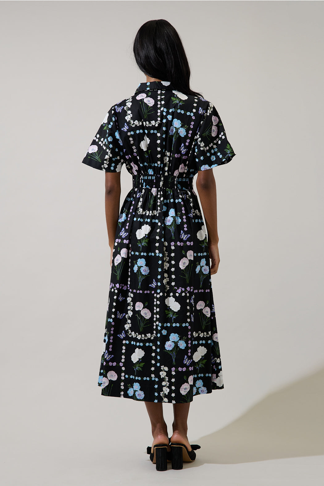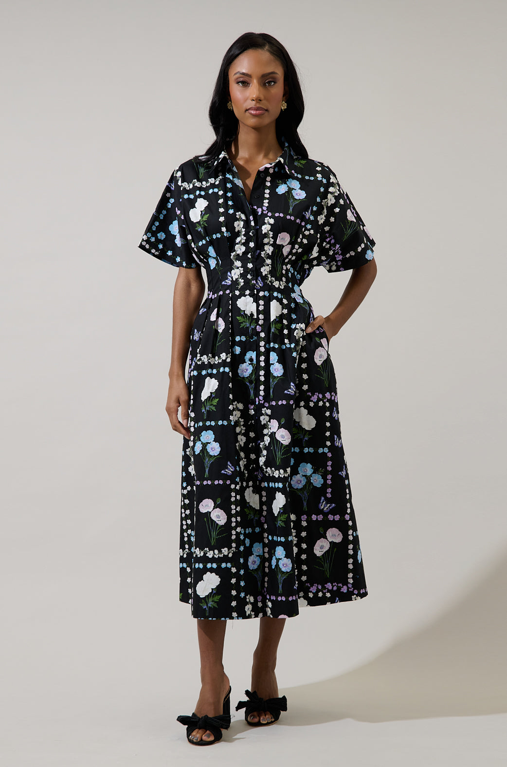 All eyes on you in this lovely floral midi. It features a button-down front, short sleeves, a smocked waist, and pleated details, offering a flattering silhouette with functional side pockets. Style it with espadrilles and a woven tote for a chic look.